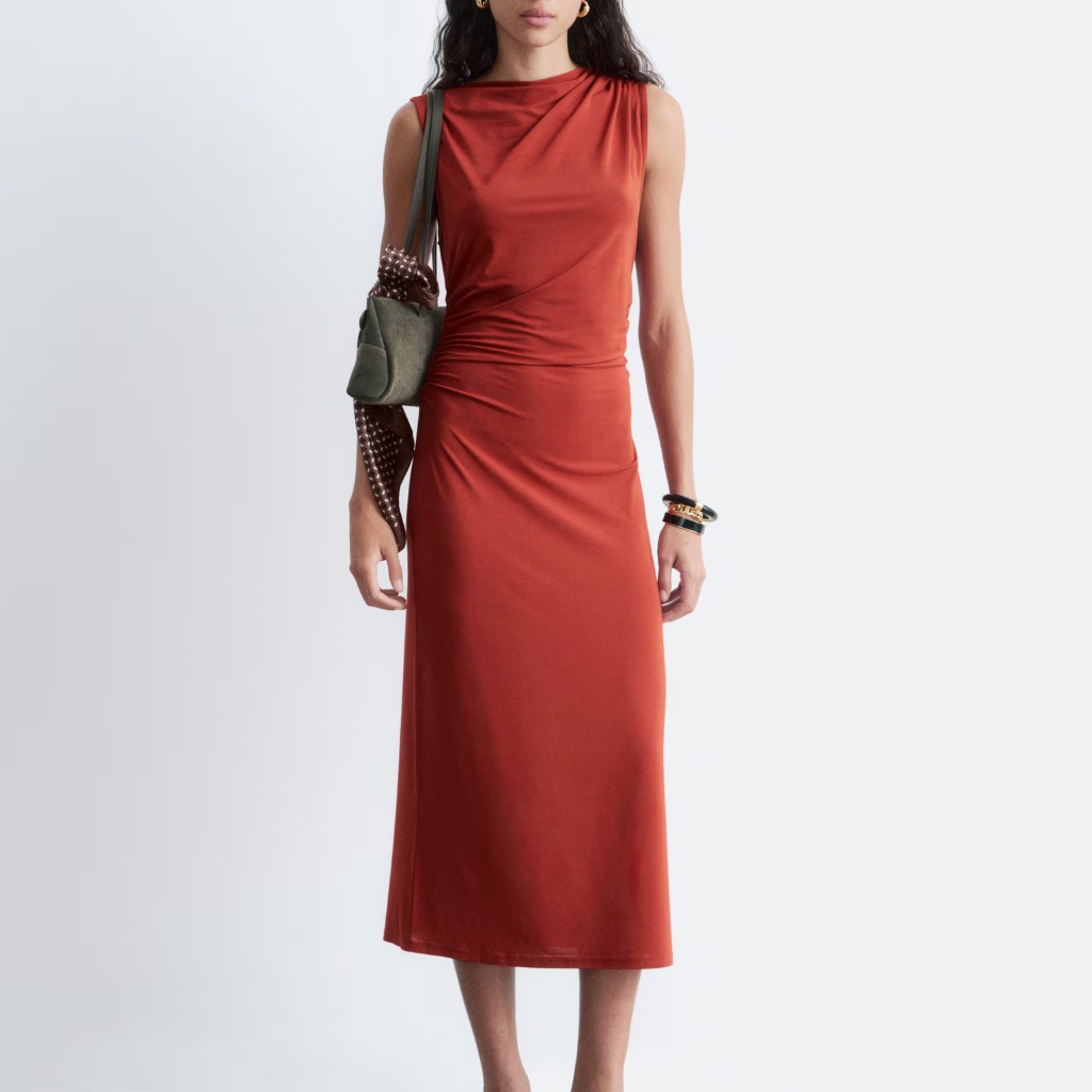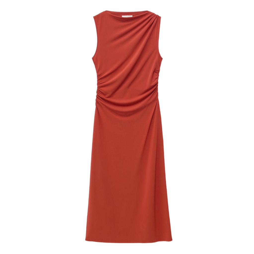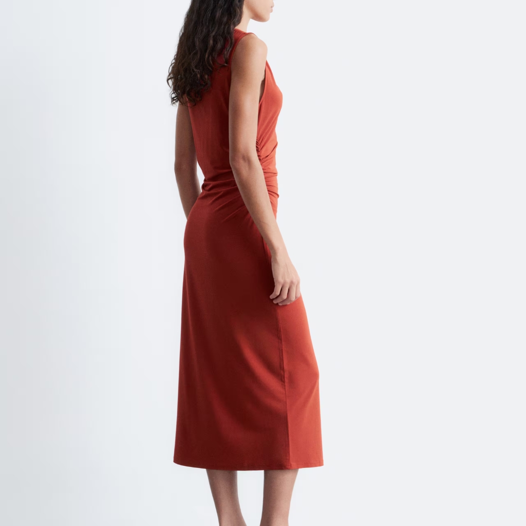 Women’s midi dress made from soft, stretchy jersey fabric designed for a sleek and comfortable fit. This sleeveless dress features a boat neckline and a slim silhouette that follows the body’s shape. Subtle ruching at the shoulder and waist adds a draped effect, enhancing the overall look with gentle structure. The midi length makes it suitable for both casual and dressy occasions, offering versatile styling options.