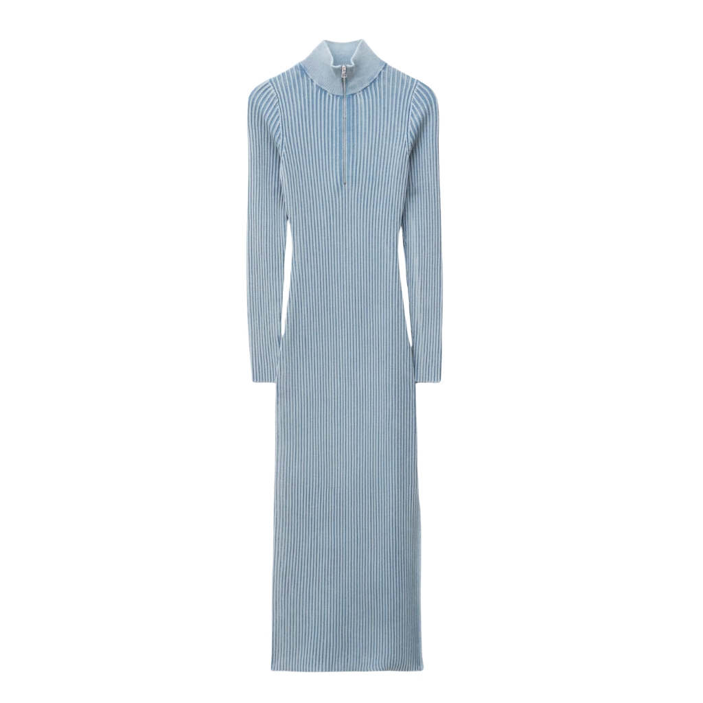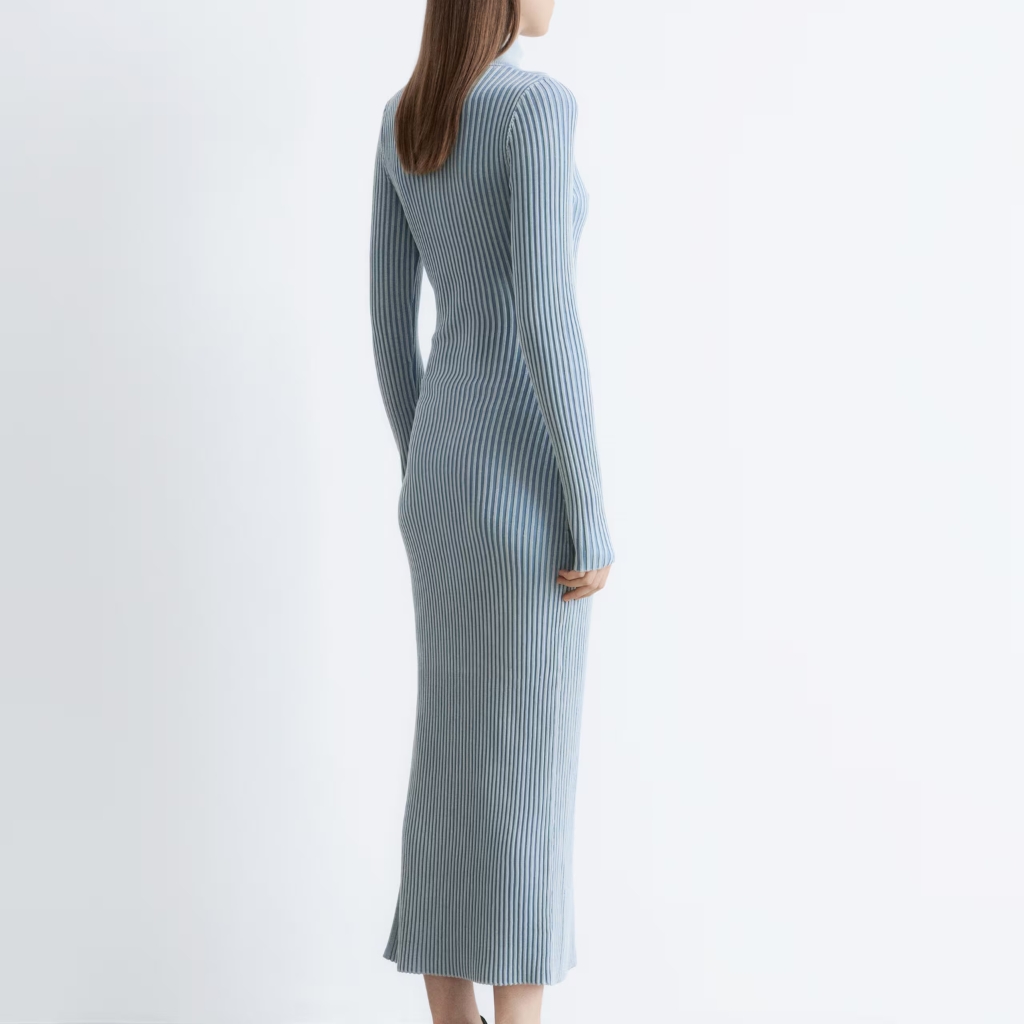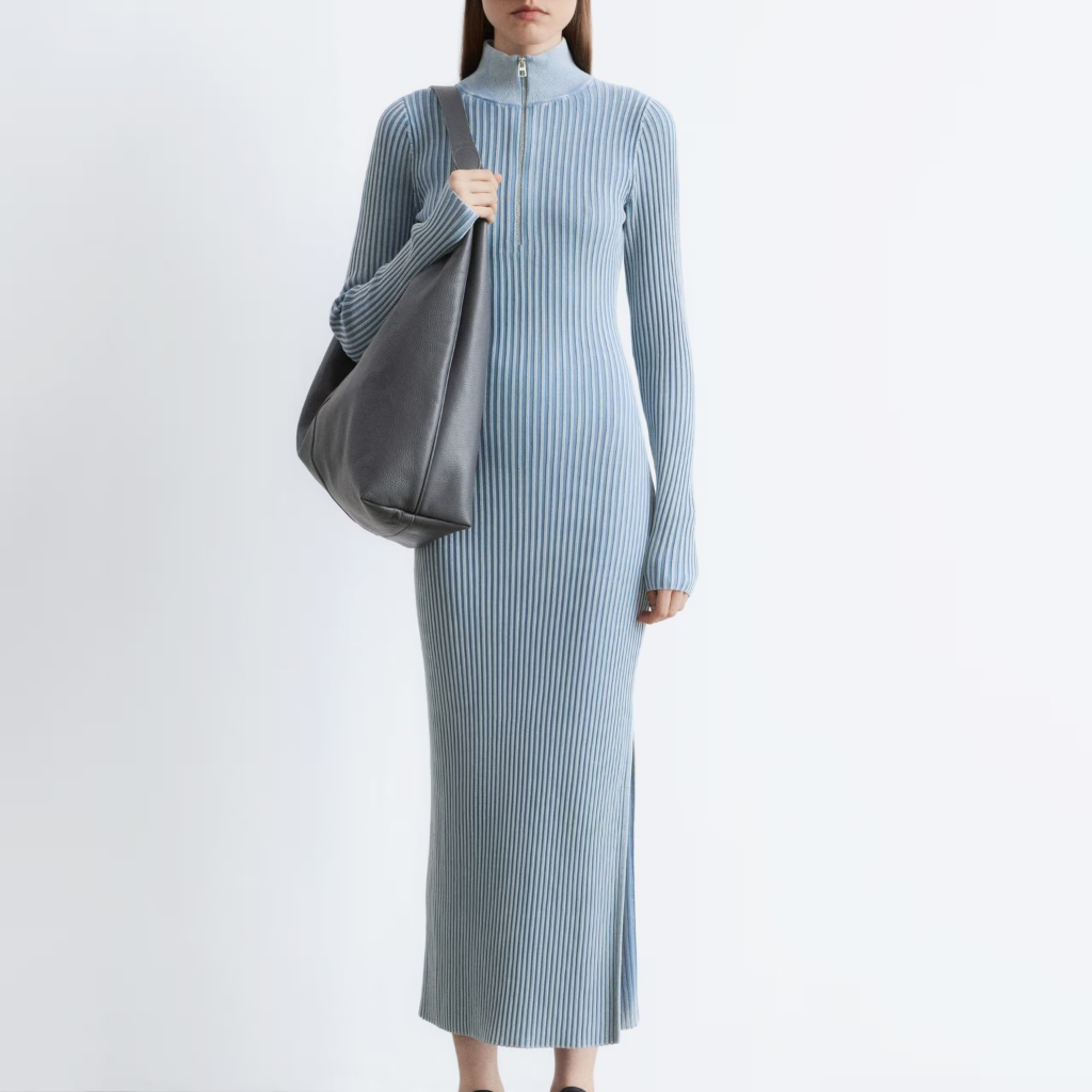 Ribbed maxi dress featuring a zip-up mock turtleneck collar, long sleeves, fitted silhouette, and side slit details for a clean and contemporary style.