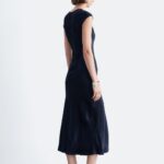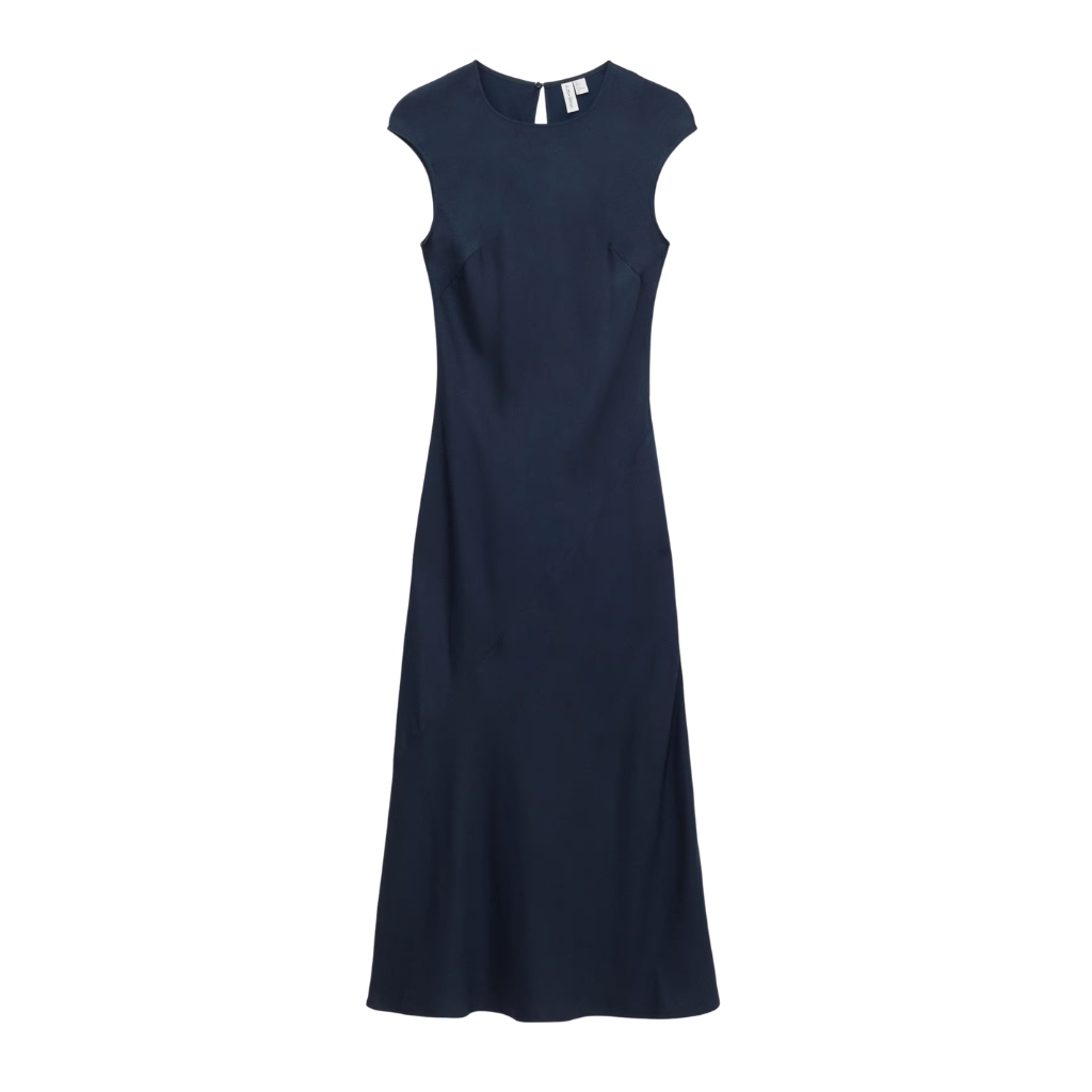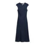 Women’s maxi dress crafted from fluid viscose satin, designed with a smooth drape and elegant silhouette. This dress features a round neckline with a back keyhole opening and button-and-loop fastening for a refined finish. The slim fit is enhanced by bust darts and diagonal seam detailing, creating a structured yet flowing shape. The cap sleeves and full-length design make it suitable for formal events, evening wear, or special occasions.