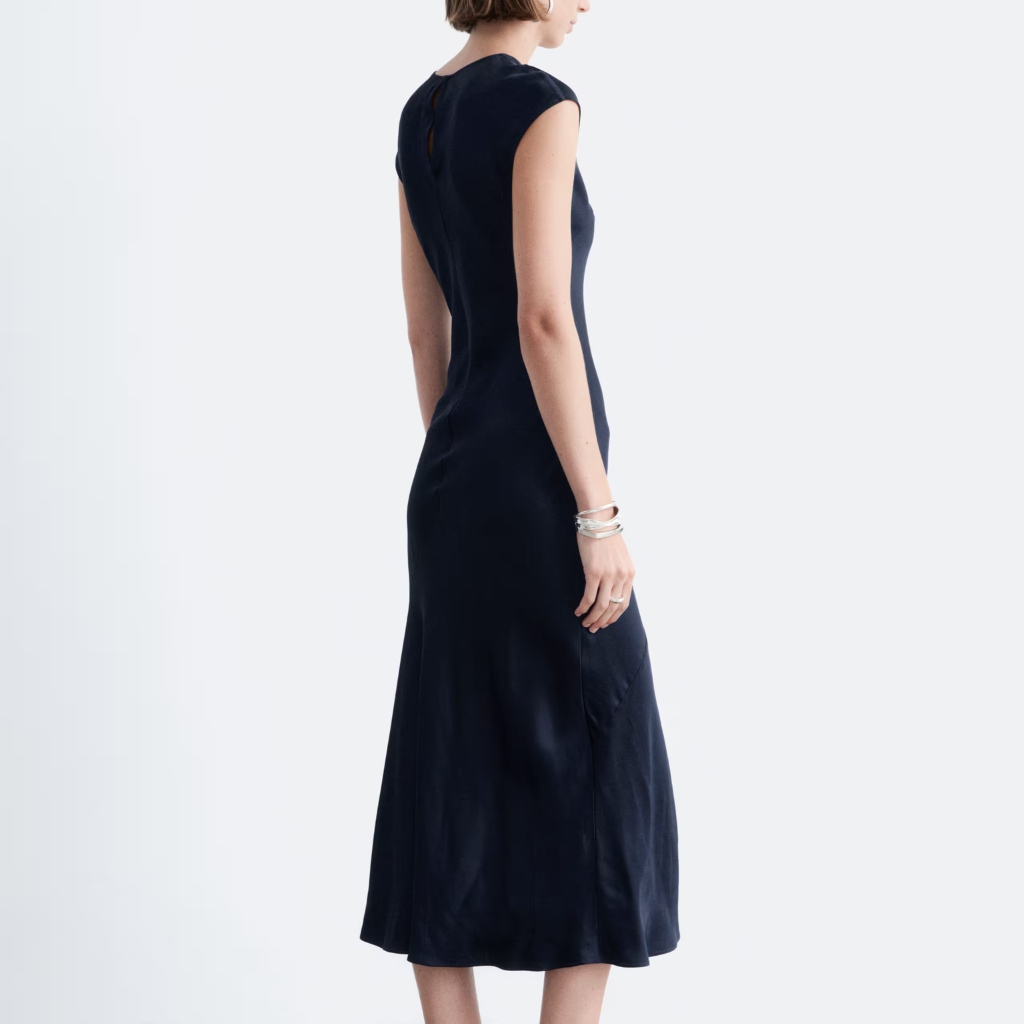 Satin maxi dress featuring a round neckline, cap sleeves, back keyhole detail with button closure, and diagonal seam construction for a clean and elegant look.